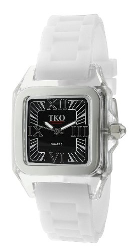 Whether you're carrying a briefcase or a gym bag, the TKO Unisex Riviera Plastic Case and Rubber Strap Watch will fit your style. The square black dial is formally dressed with large Roman hourly indexes at three, six, nine, and 12 o'clock and has a wide art deco frame of luminescent silver-tone second markers of varying thicknesses. A shining stainless steel bezel with soft contoured edges is housed by a durable plastic case and connects to a sporty white band that is made of textured rubber and that has a handy buckle clasp. Well-suited for the active person who has distinct taste, the Unisex Riviera boasts water resistance to 99 feet (30 M) and the reliability of Japanese-quartz movement. The watch arrives in an exclusive TKO gift box.