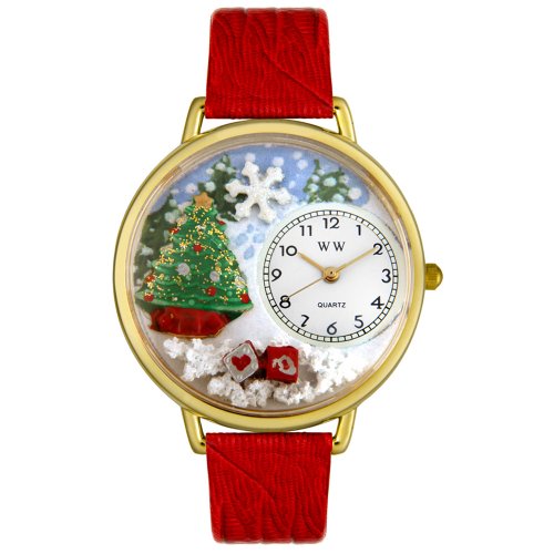 Show your excitement for the Christmas season with a quirky, unique piece of art for your wrist. Whimsical Watches' Christmas Tree Watch for Women is a fun-loving timepiece featuring handcrafted Christmas-themed miniatures that have been carefully placed under the domed crystal. Other highlights of the watch include an analog dial with Arabic hourly indexes, a gold-tone stainless steel case and bezel, and a textured red leather band with buckle closure. This imaginative, eye-catching watch is water resistant to 100 feet (30 M) and features Japanese-quartz movement.